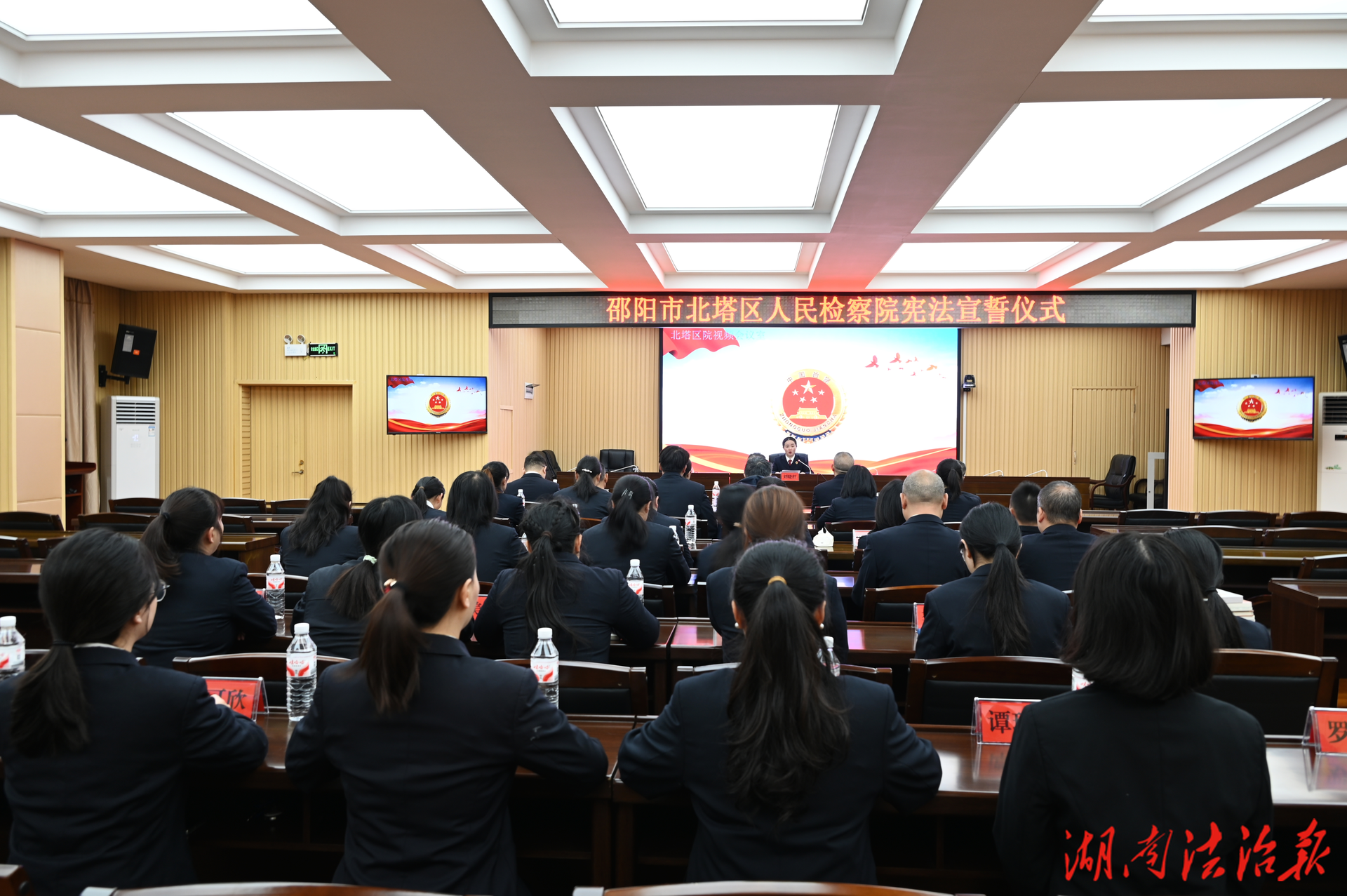 “我宣誓:忠于中华人民共和国宪法,维护宪法权威,履行法定职责……”上午九时,院党组书记、检察长刘晓红右手举拳,领诵誓词,全体检察人员齐声跟诵。誓言掷地有声,久久回荡,叩击在每一位检察人员的心头。