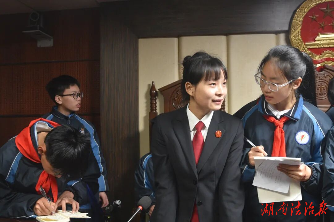 在庄严肃穆的审判庭,干警逐一介绍了审判长、审判员、书记员、原告、被告等诉讼参与人的席位设置及职责,并就法徽、法槌等法院元素的象征意义和文化内涵进行了阐释。让同学们直观感受司法程序的严谨规范,亲身感受“手握法槌”的责任感,真切体会到法律的庄重与威严。