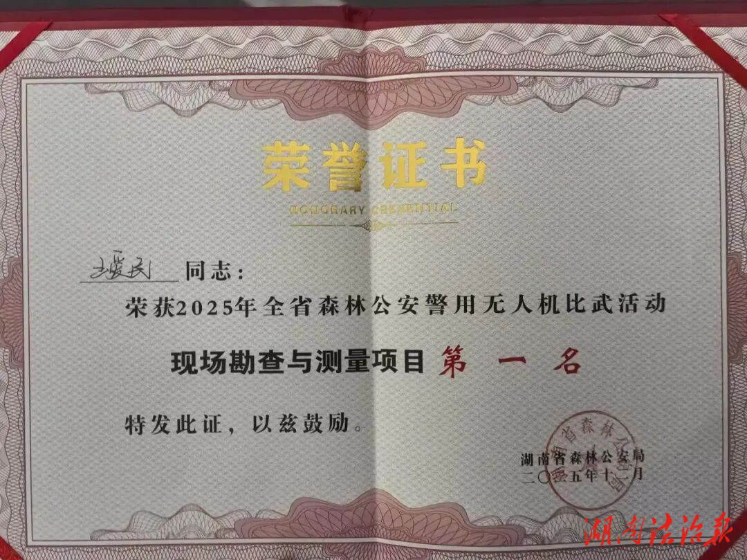 湖南法治报讯(通讯员 李爽 周妍 杨思怡)日前,在刚刚结束的2025年湖南省森林公安警用无人机比武中传来捷报:由邵阳市公安局精心选拔组成的参赛代表队团结协作、奋勇争先,最终脱颖而出荣获大赛团体二等奖。邵东市公安局民警王爱民代表邵阳公安参赛,在现场勘察与测绘项目荣获全省第一名、移动目标侦测项目荣获全省第四名的好成绩!
