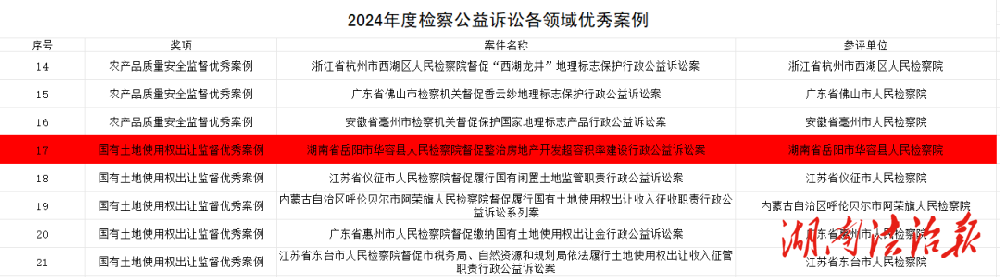 湖南法治报讯(通讯员 高远)近日,最高人民检察院检察公益诉讼研究基地举办的“2024年度检察公益诉讼精品案例”评选落下帷幕。华容县人民检察院办理的“督促整治房地产开发超容积率建设行政公益诉讼案”获评国有土地使用权出让监督优秀案例。