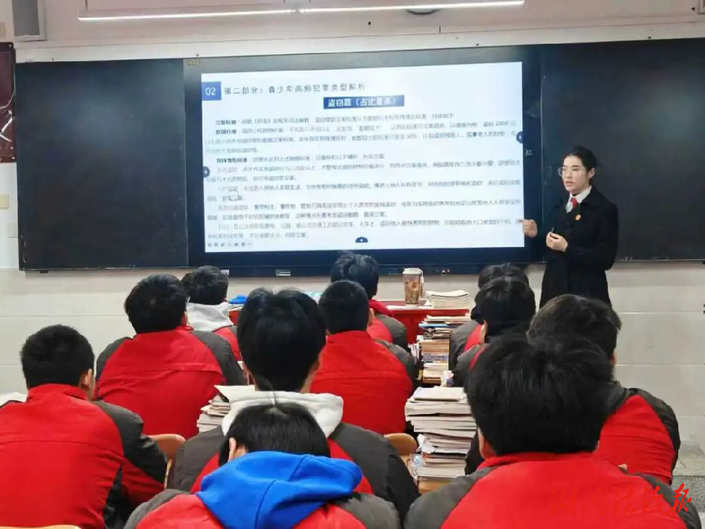 课堂上,干警围绕“刑事责任年龄核心规定”“青少年高频犯罪类型解析”“犯罪成因与常见诱因剖析”“法律后果与司法处置原则”以及“自我保护与犯罪预防实操”五个方面详细阐述,并结合近年来青少年违法犯罪典型案例,深度剖析行为边界与法律后果,用鲜活案例揭示触碰法律底线的严重危害,让抽象的法律知识变得具体可感。