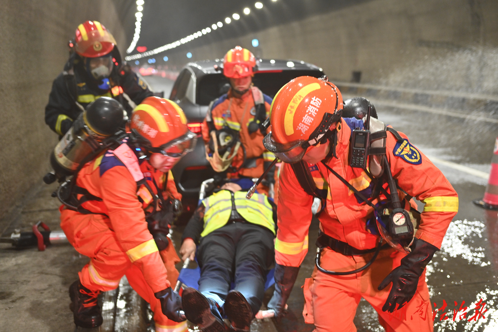 救援现场各小组分工明确、协同作战:灭火组快速架设水带干线,并出动灭火机器人实施降温灭火;破拆救援组携带专业装备进入隧道,通过热成像仪锁定被困人员位置,快速完成变形车门破拆作业,成功解救被困人员。伤员被转移至隧道入口后,医疗救护组立即开展初步救治,随后将其转运处理。