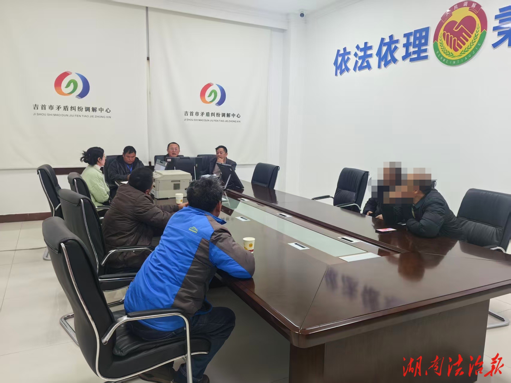(2025年12月15日,吉首市综治中心调解室内,市诉调中心法官及调解员正调解一起农民工群体欠薪纠纷)