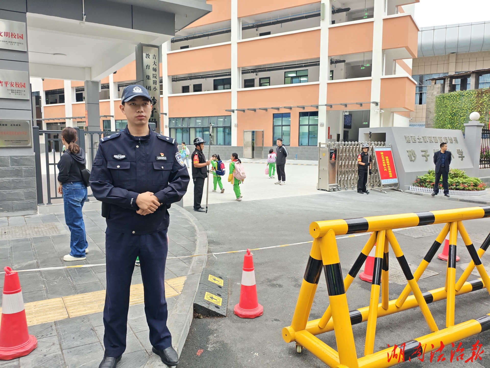 (上下学人群车流高峰时段,湘西土家族苗族砂子坳小学门口“警+N”护学岗履职尽责、防冲撞设施焕然一新)