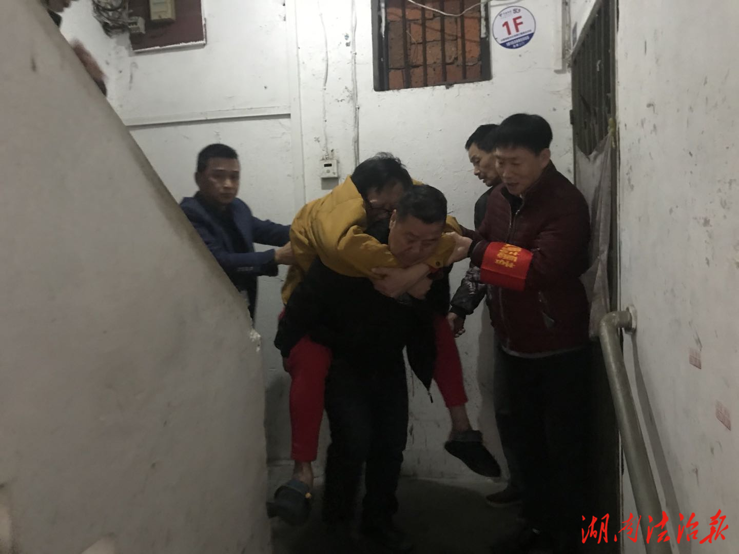姚孟林老人在家不慎摔倒,社区工作人员和志愿者小心翼翼地将老人背下楼。