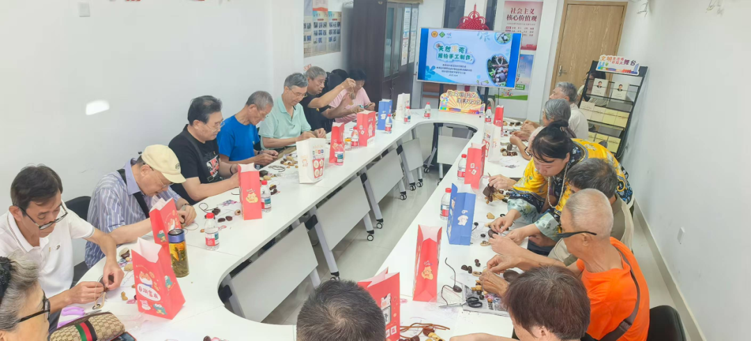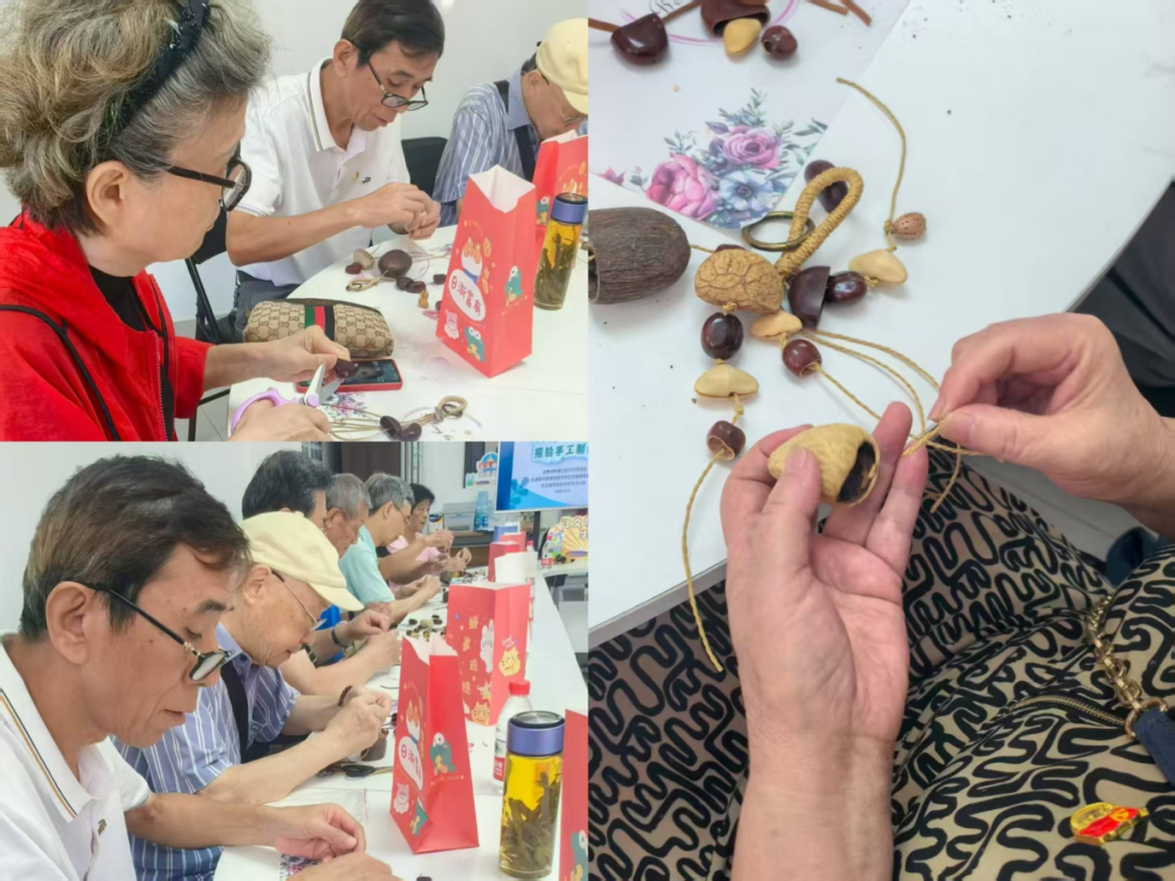 在制作过程中,大家互帮互助,既有老朋友的自然默契,又有新伙伴的主动搭话,现场氛围热闹又温馨。76岁的李爷爷手持半成品,笑着感慨:“真没想到,平时不起眼的果壳,能做成这么精致的摇铃!既环保又有意思,和大家一起动手特别开心!”