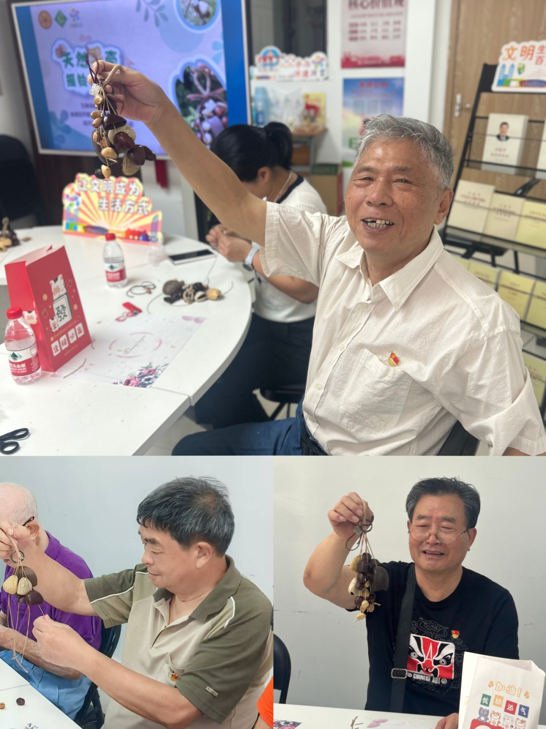 经过一个多小时的巧手创作,一个个形态各异、晃动时发出清脆声响的天然果壳摇铃陆续完工。老同志们手捧自己的作品拍照留念,脸上满是自豪与成就感。