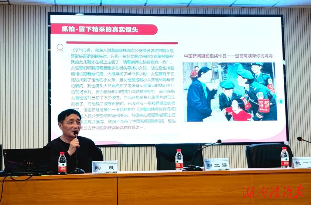 胡立强曾任人民公安报社驻湖南省公安厅记者站站长,曾获中国人大新闻一等奖、中国新闻摄影银奖。讲座中他为大家展示了大量优秀的作品,从新闻摄影的体会与思考展开讲座:在进行新闻摄影时既要讲政治,又要讲艺术,要围绕当前工作重心及下基层活动的典型来抓拍;在进行新闻摄影时还要讲原则,要追求真实性与时效性;要培养自己有一双能发现美的眼睛,选择独特角度或利用其他物体来衬托主题。