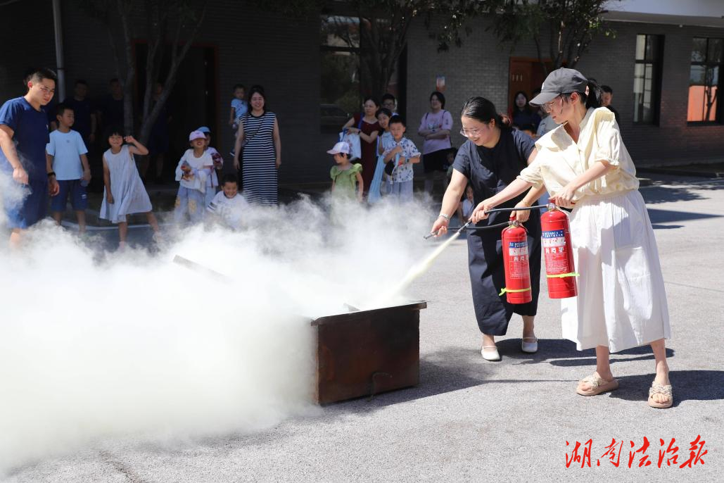 消防宣讲员还结合暑期特点,针对家庭常见的火灾隐患、火灾报警要点、火场逃生自救技巧等进行了详细讲解。最吸引孩子们的是灭火器材实操教学。在消防员的专业指导下,家长们严格按照“提、拔、握、压”的操作步骤进行实战灭火演练,进一步增强了检察干警与干警子女的消防安全意识。