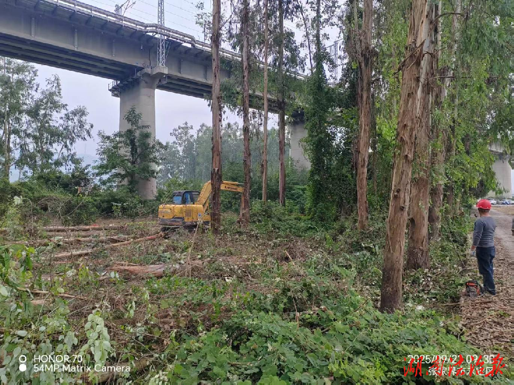 9月22日,阳湖坪街道办事处联合区护路办、区交通运输局、区城管局、阳湖坪派出所等部门开展联合整治行动。行动前,各部门周密部署,制定科学砍伐方案,并提前与苗木基地负责人沟通协调,确保工作依法依规、顺利推进。此次行动砍伐桉树125株,清理面积2.311亩,有效消除了黔张常铁路沿线可视范围内的安全隐患,为高铁安全通行提供了坚实保障。