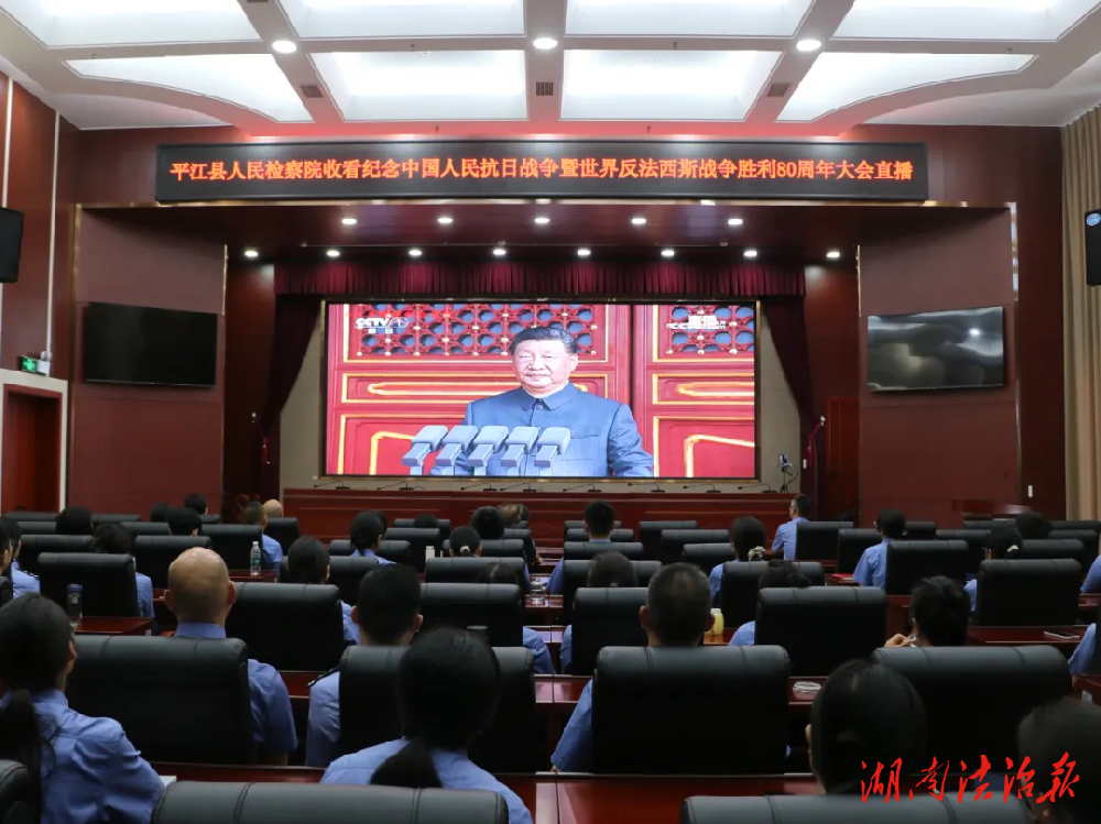 湖南法治报讯(通讯员 徐晓玲) 9月3日上午,平江县人民检察院组织全院70余名干警、书记员集中收看纪念中国人民抗日战争暨世界反法西斯战争胜利80周年大会直播。天安门广场上,45个方(梯)队准备就绪,会议室里,检察干警们正襟危坐,眼中闪烁着敬畏和自豪,期待见证这一具有重大政治意义和深远历史意义的国家盛典。