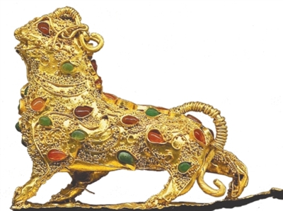 东汉中山穆王刘畅墓出土掐丝镶嵌金辟邪。 |