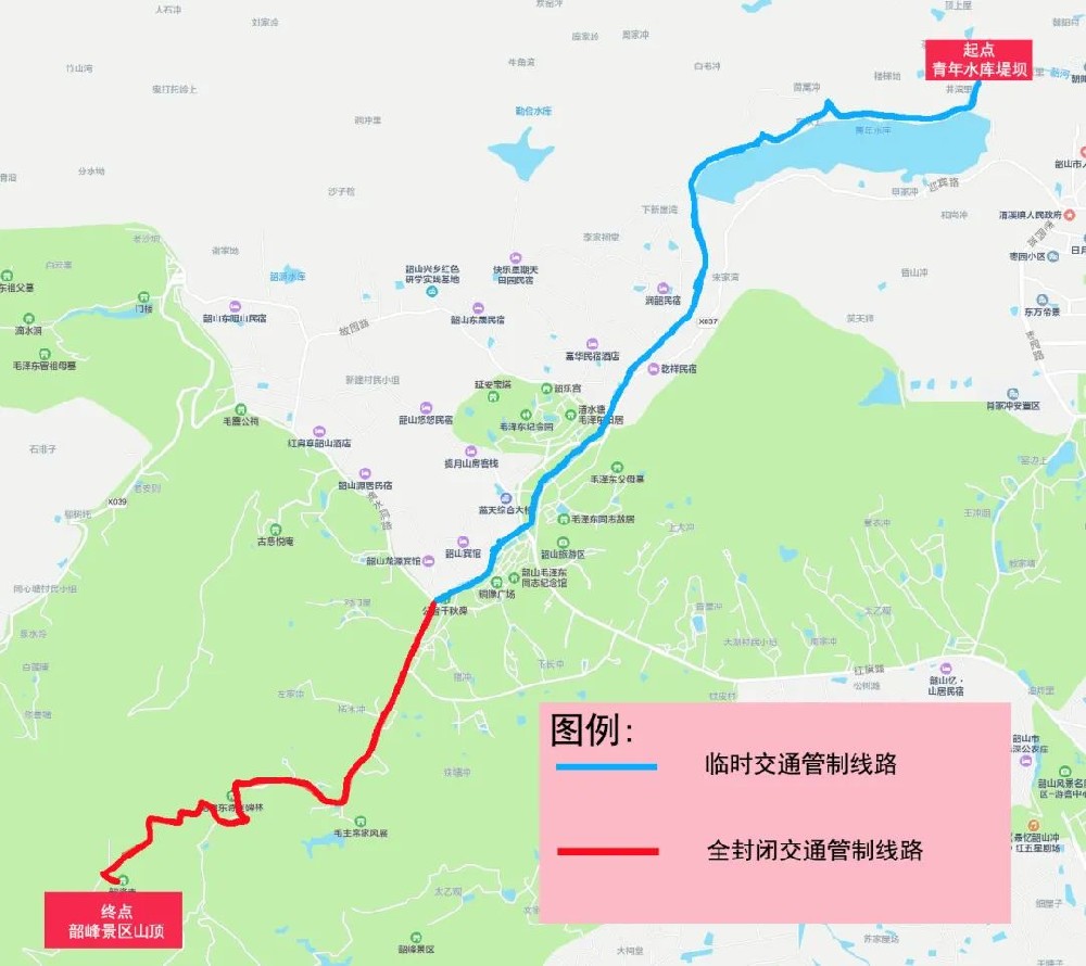 7月10日上午,首届“青春无畏 韶峰相会”走好新时代长征路登高活动将在韶山举行。当日7:00至8:30青年水库堤坝河长制主题公园至景区门楼比赛线路实行临时交通管制(选手经过比赛路口时实行临时交通管制),8:00至10:00景区门楼至韶峰景区路段实行全封闭交通管制。全封闭管制路段禁止社会车辆通行。