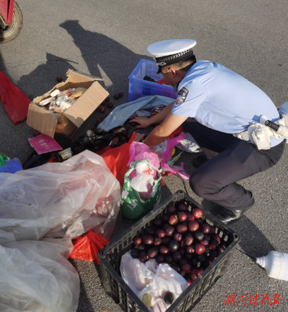 “当时在开展驾考直播,无意间看到两名交警顶着高温,蹲在路边把散落一地的水果一个个捡到车主车上。给交警叔叔点赞!”网友回忆道。