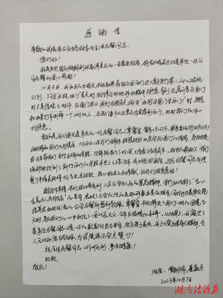 纸短情长,字见初心。2025年10月11日,张家界市公安局武陵源分局收到了一封来自外地游客的手写感谢信。感谢信娟秀工整的字迹里,藏着一段发生在张家界国家森林公园景区南门的暖心故事,映照出武陵源公安对“旅游警务,平安服务”的生动诠释。