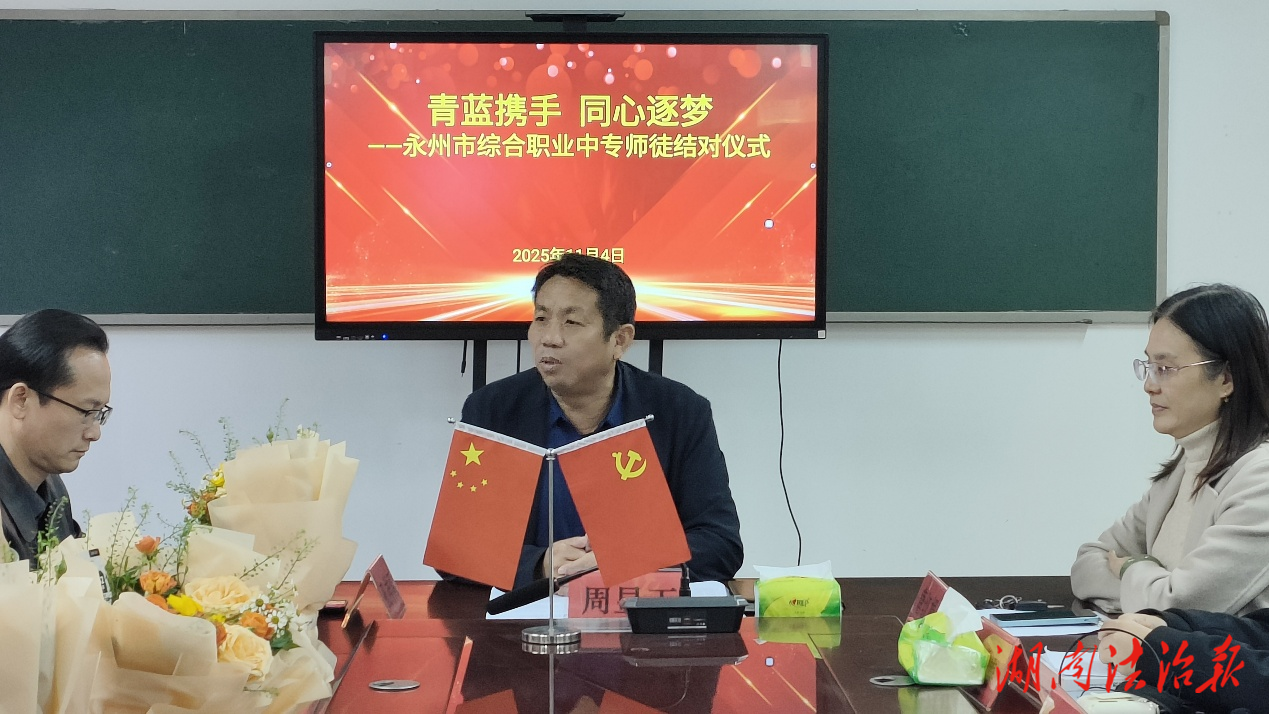 湖南法治报讯(通讯员 孔祥凤 唐红娟 伍双林)11 月 4 日下午,永州市综合职业中专2025-2026学年“青蓝工程”启动仪式在实训楼会议室温情启幕。本次仪式由教科信息中心副主任、永州市计算机应用名师工作室负责人伍双林主持,校长周显玉、副校长孔祥凤、教科信息中心主任唐红娟及所有结对师徒参与。庄重有序的环节、饱含期许的交流,开启了学校 “以老带新、教学相长” 的师资建设新征程。