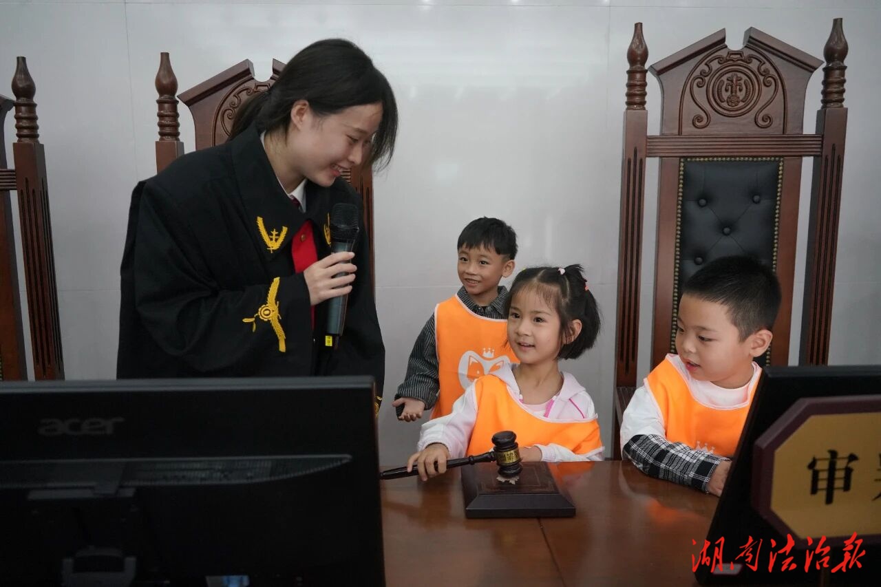 小朋友们认真倾听,在干警的邀请下有序走上审判席,尝试敲响法槌,深入感受司法的庄严与温度。在互动提问环节,干警与小朋友们再次重温了法治小知识,在寓教于乐中强化了小朋友们的法治观念。