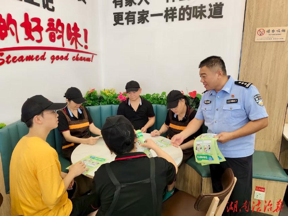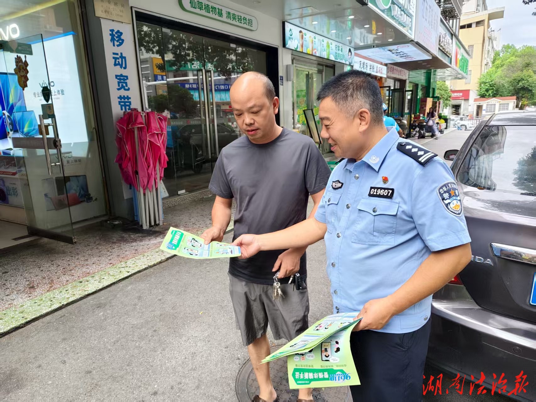 湖南法治报讯(通讯员 邹利清)为切实提升辖区群众以及门店经营户经商人员的反诈骗、 最大限度减少群众经济损失,近日,伍家岭派出所花城警务室社区民警周建走进沿街门店开展反诈防盗宣传活动。