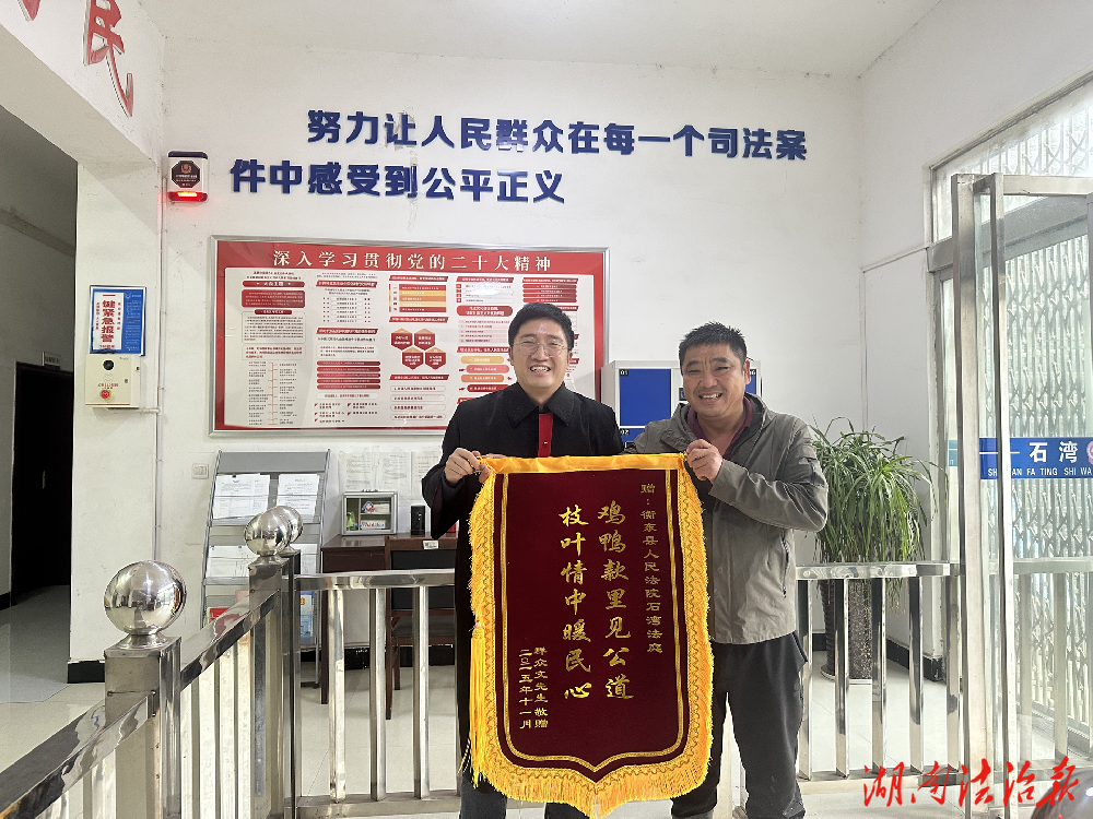 近日,衡东县人民法院石湾人民法庭庭长郭朋程收到了一份特殊的“礼物”——辖区养殖户文某送来的一面锦旗。红彤彤的绒面上“枝叶情中暖民心,鸡鸭款里见公道”十四个金黄大字格外醒目。这面锦旗,不仅承载着当事人真挚的谢意,更凝聚着人民法院在办理一起“小案”中所展现出的司法为民情怀与维护公平正义的坚定决心。
