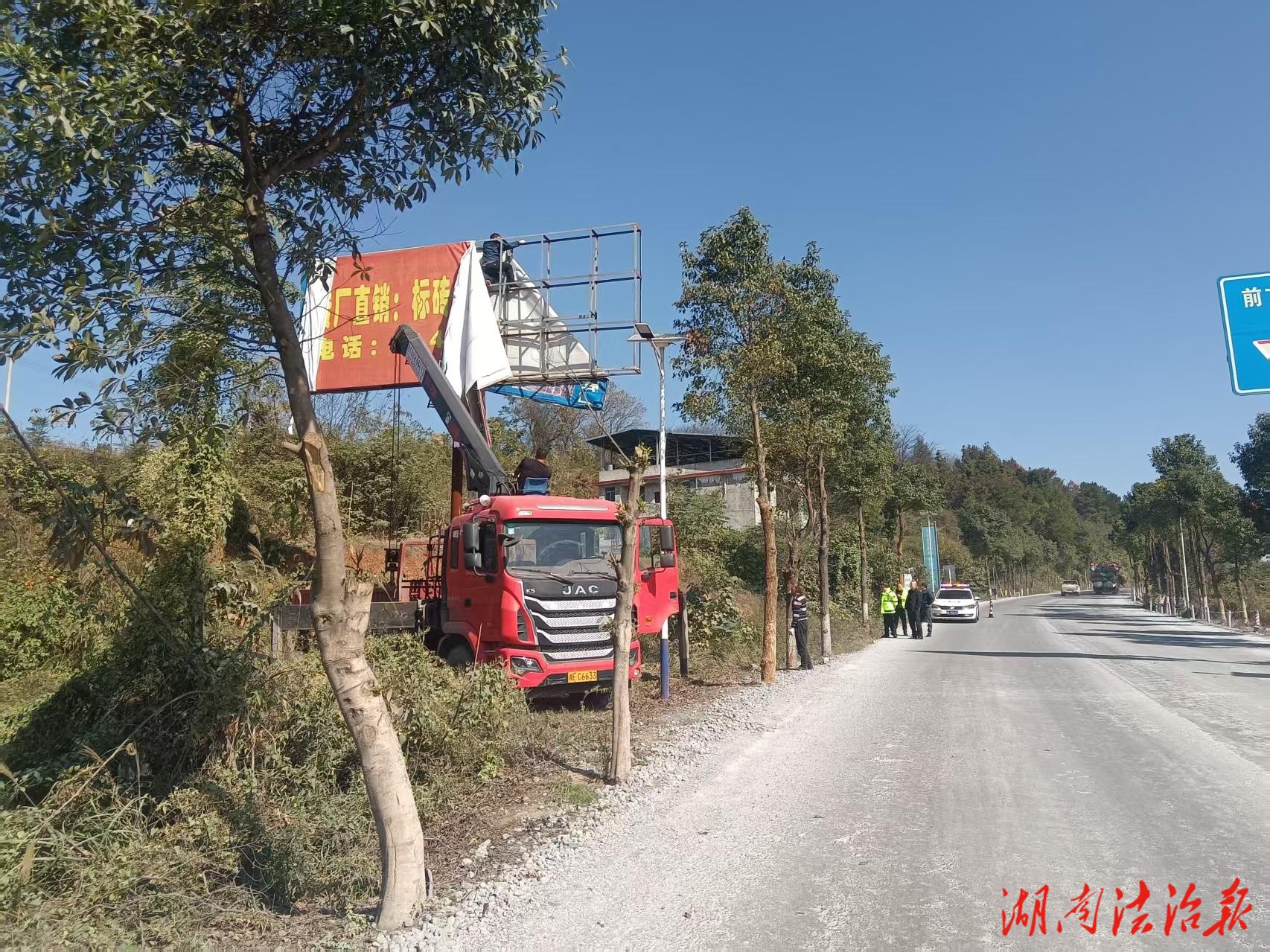 湖南法治报讯(通讯员 唐海通 唐勇军)近日,细心的市民行经G356、G207等邵阳县境内国省干线时,会发现道路沿线视觉清爽了许多。以往一些陈旧破损、设置不规范的大型非公路标志牌和小广告牌已不见踪影,路域环境得到有效提升。这一变化,源于邵阳县交通运输综合行政执法大队(以下简称“执法大队”)近期开展的一场针对老旧非公路标志牌的专项集中整治行动。