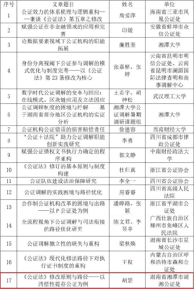 湖南法治报(通讯员:李思媛)近日,由湘潭大学司法部公证理论研究与人才培训基地主办的“第四届中国公证改革与发展研讨会暨《公证法》颁布二十周年学术研讨会”征文评选结果正式揭晓,湘潭市湖湘公证处党支部书记、负责人胡罡撰写的论文《<公证法>修改原则与路径——以清偿性提存公证为例》凭借扎实的理论功底、鲜明的实务导向及创新的解决方案,从全国众多参赛作品中脱颖而出,荣获三等奖,为湖南公证行业在全国性学术交流中赢得了荣誉。