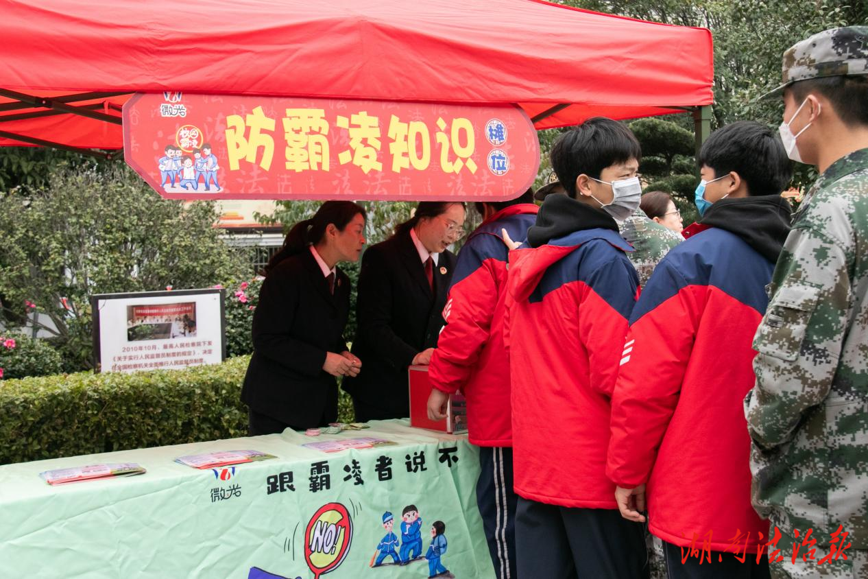仪式过后,广场已悄然变身“法治集市”。宪法知识、未成年人保护法、防校园霸凌、防性侵自我保护、家庭教育法、预防犯罪,6个主题鲜明的“学法摊位”构成一道亮丽的风景线。展板上案例鲜活,检察人员讲解耐心,同学们手持法律手册,一边翻看学习,一边穿梭于各个摊位之间:“校园欺凌的主要形式有哪些?”“遭遇网络暴力该怎么办?”……现场问答声、讨论声、欢笑声此起彼伏。学法答题、套圈得物,这不仅是游戏,更是润物无声的法治启蒙。