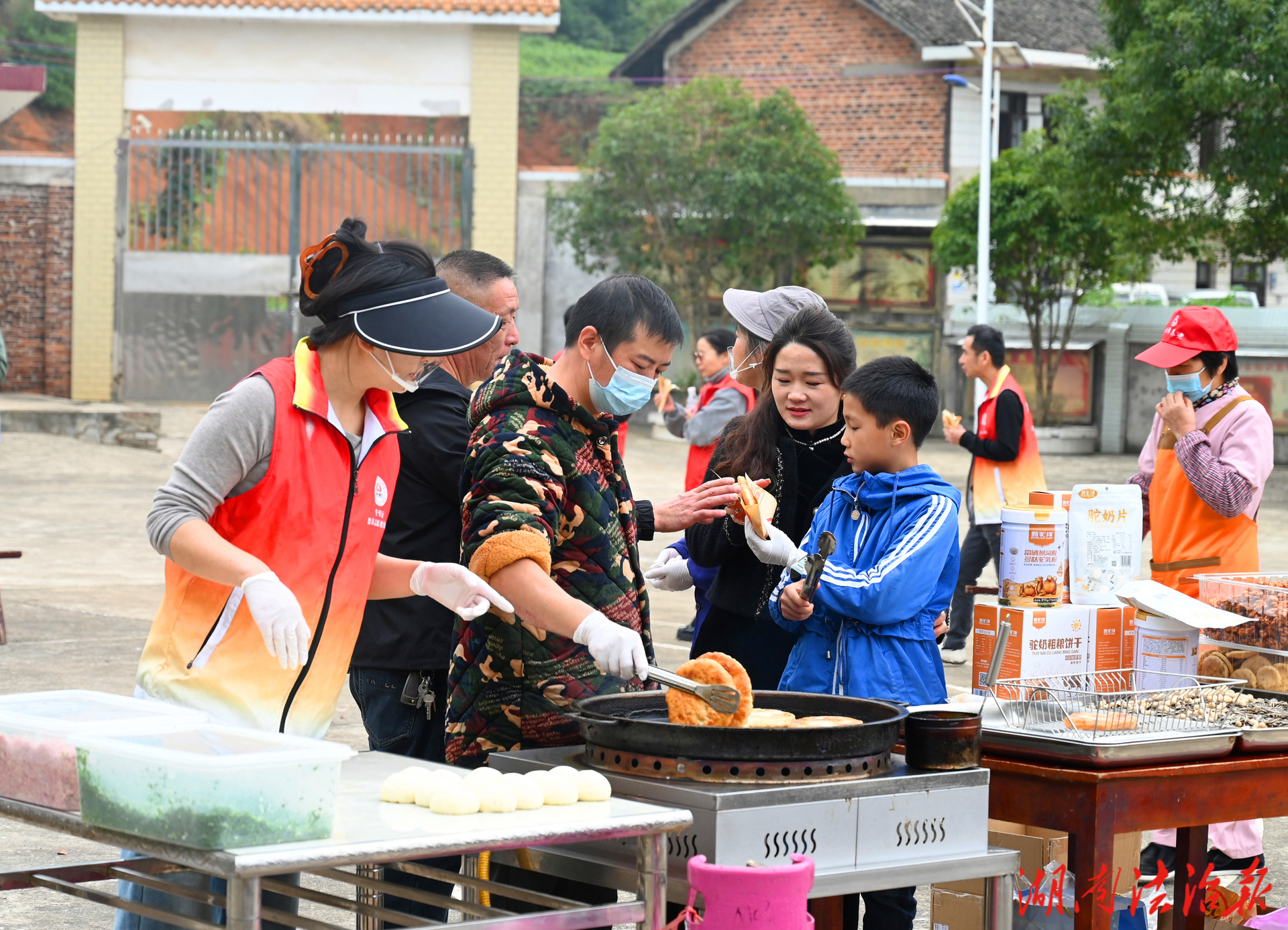 活动现场暖意融融,志愿者们分工明确、热情高涨。有人为老人递上热气腾腾的香葱肉饼,有人耐心剥好桔子、递过香蕉;不少志愿者围坐在老人身旁,倾听他们讲述过往岁月,陪老人拉家常、话近况;还有志愿者带来精心编排的节目,悠扬的歌声萦绕庭院,欢快的笑语此起彼伏,让敬老院里满是温馨和睦的氛围。