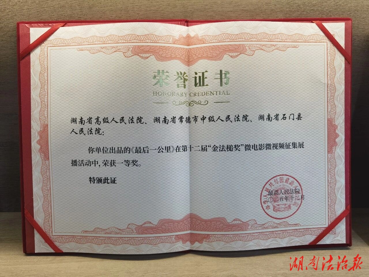 其中,常德中院联合湖南高院、石门县法院创作的纪录片《“最后一公里”》荣获全国法院“金法槌奖”微视频类一等奖。常德中院联合常德市委政法委、澧县法院、临澧县法院、武陵区法院创作的微电影《消失的警钟》荣获全国法院“金法槌奖”从严落实"三个规定"特别单元二等奖。